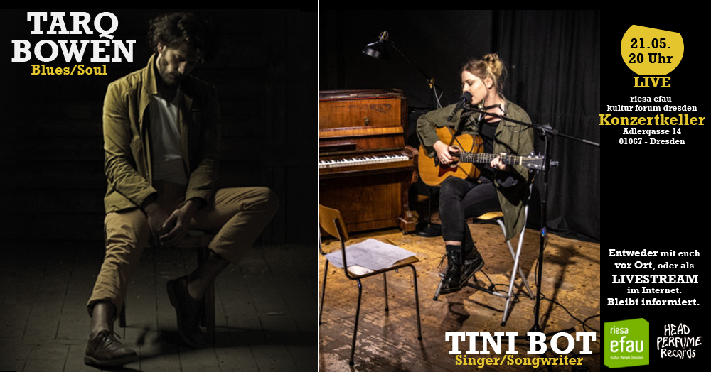 Get Your Head Perfumed No.2 im Konzertkeller des riesa efau! (Adlergasse 14, 01067 Dresden) Entweder mit euch als Live-Publikum in Anwesenheit, oder als Stream im Internetz. TARQ BOWEN (Blues/Soul - London/Frankfurt a.M.) www.tarqbowen.com TINI BOT (Singer/Songwriter - Dresden) w